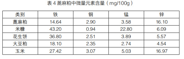 由表 4 可知,蓖麻粕中鐵、錳的含量較低,鋅的含量較高,銅的含量低于玉米,但高于米糠、花生仁粕和大豆粕。